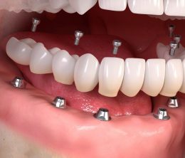 W przypadku leczenia implantoprotetycznego bezzębia, czyli całkowitego braku zębów w szczęce górnej lub w żuchwie możemy wykonać uzupełnienie ruchome, czyli protezę wspartą i mocowaną na implantach lub uzupełnienie stałe czyli most cementowany lub przykręcany do implantów.